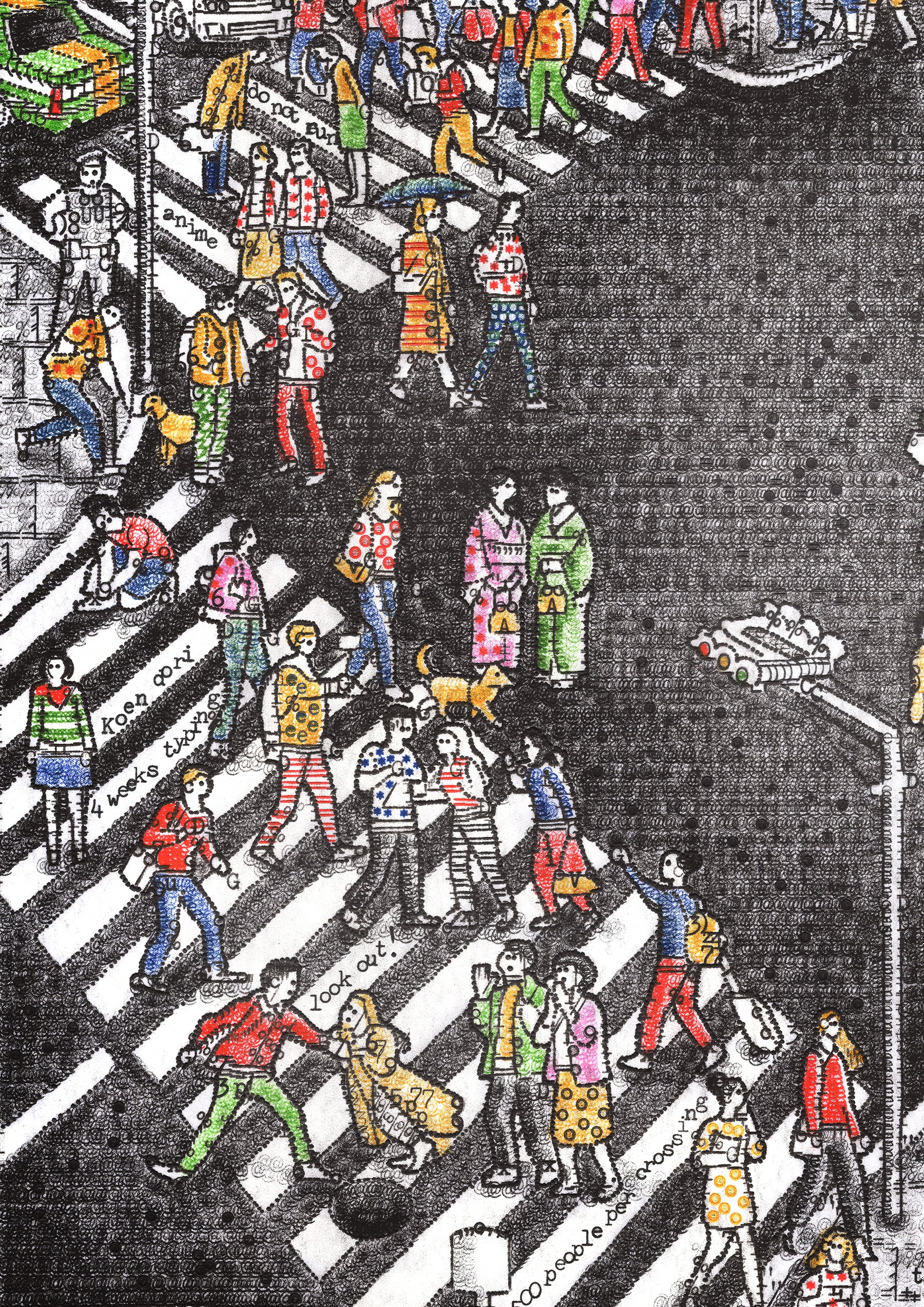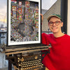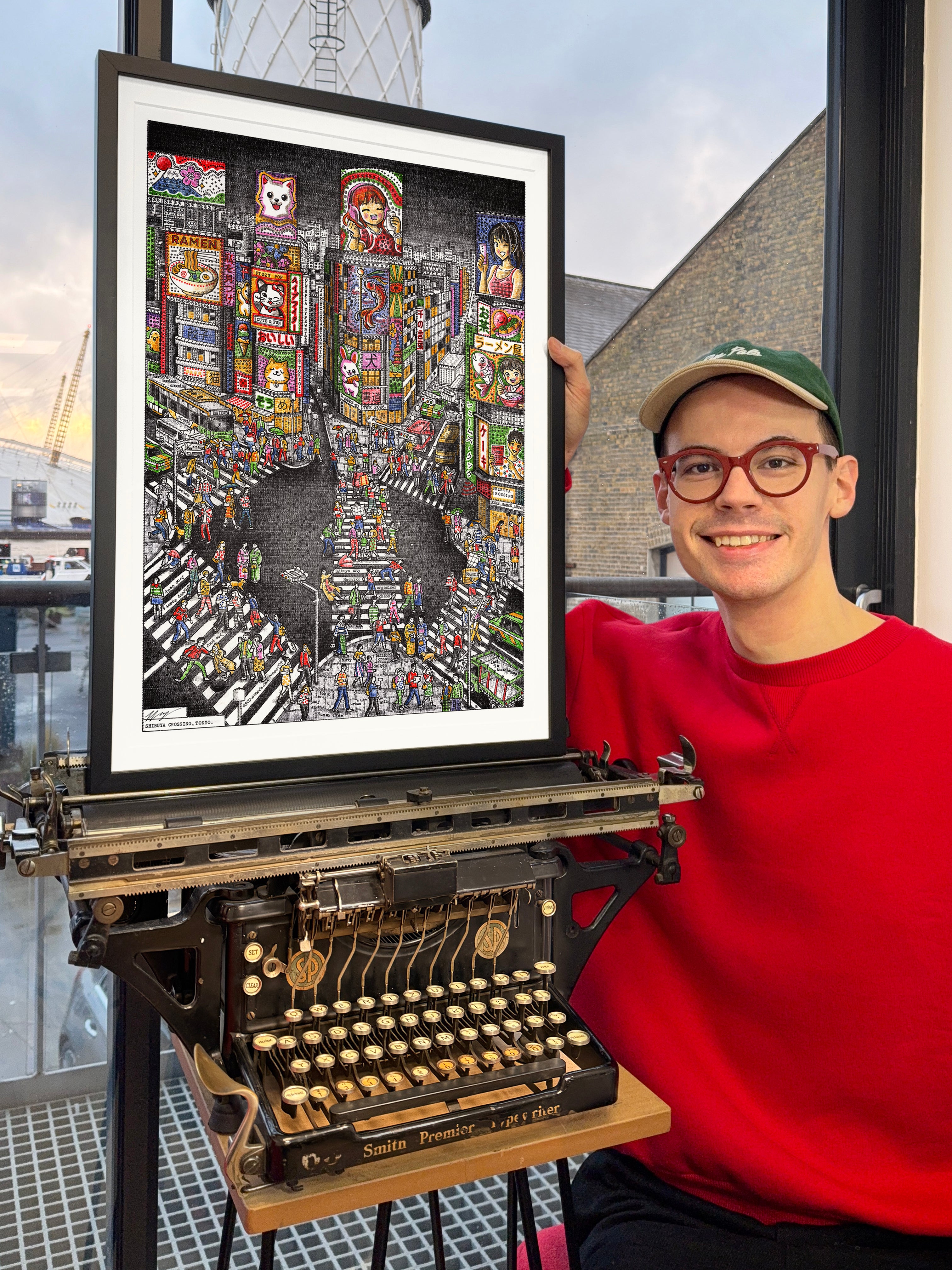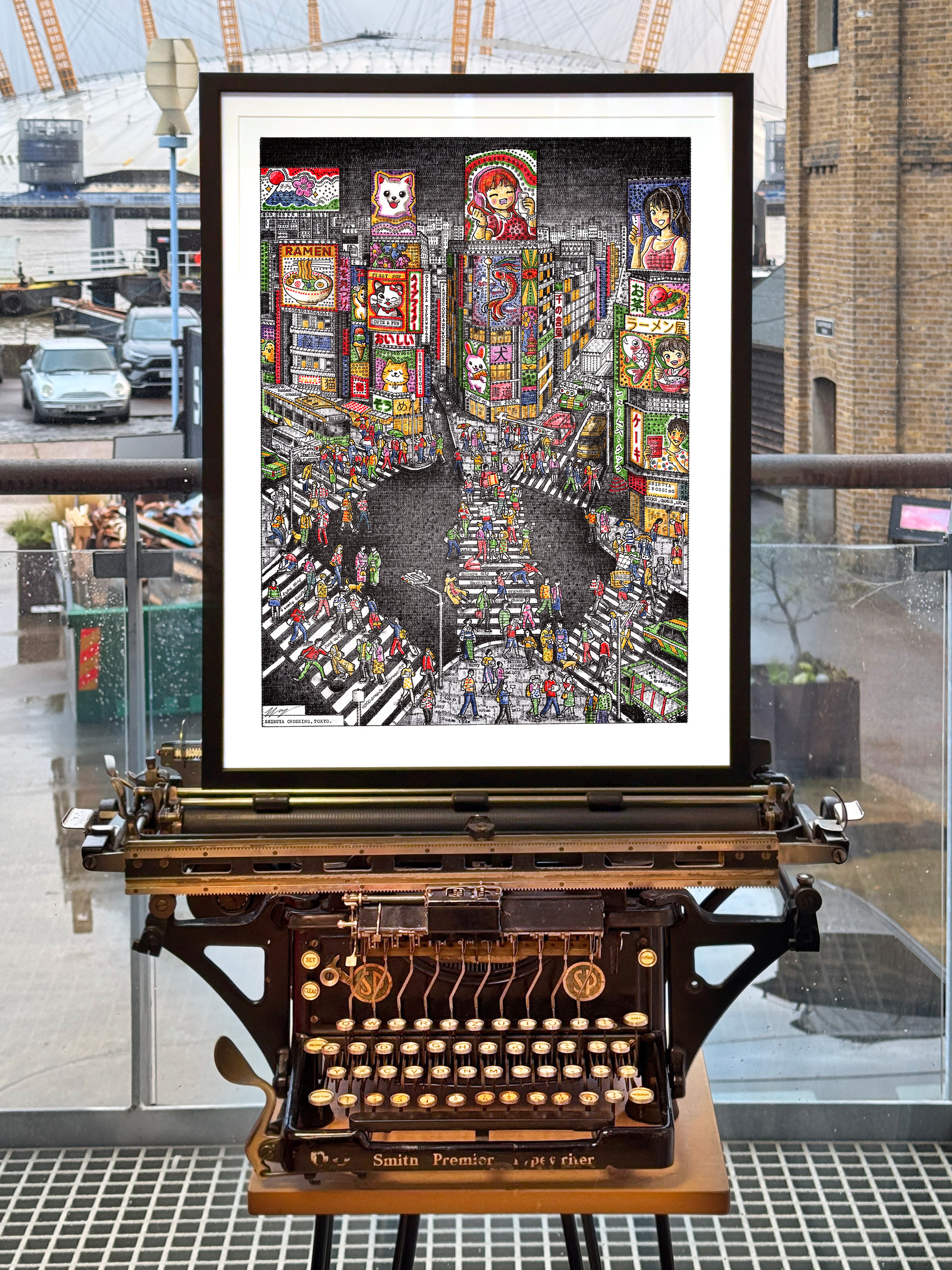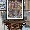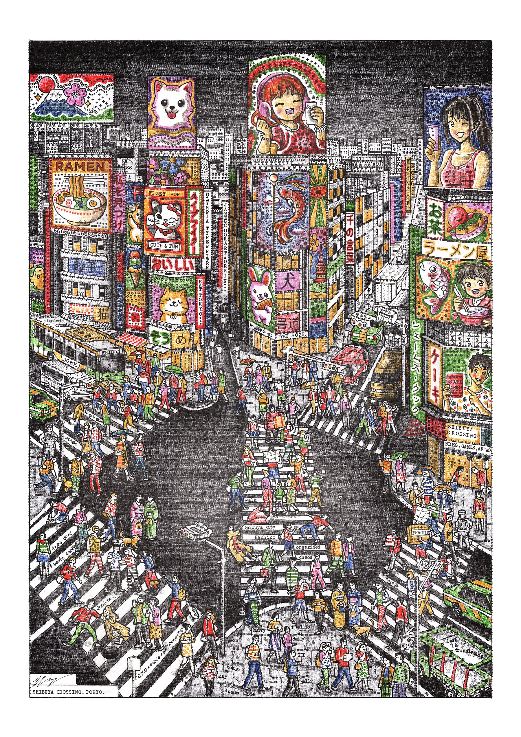 Typed over four weeks on a 1930s Smith Premier, Evening in Tokyo captures the neon energy of Shibuya Crossing. I have used my entire collection of vintage colour ribbons to bring the scene to life, populating it with hundreds of pedestrians and hidden micro-stories—from a tourist limbo-ing under a selfie stick to a gentleman carrying a massive cake.