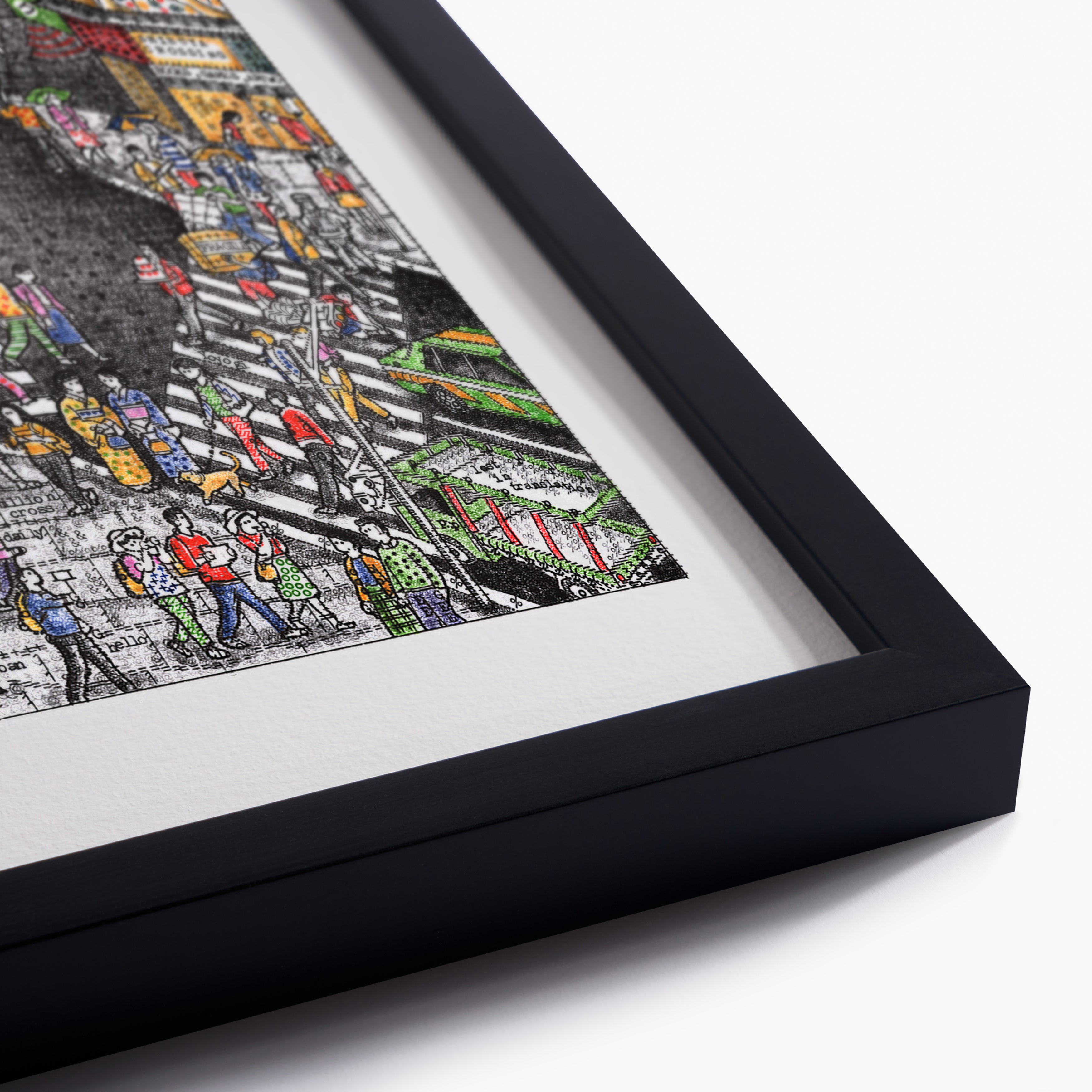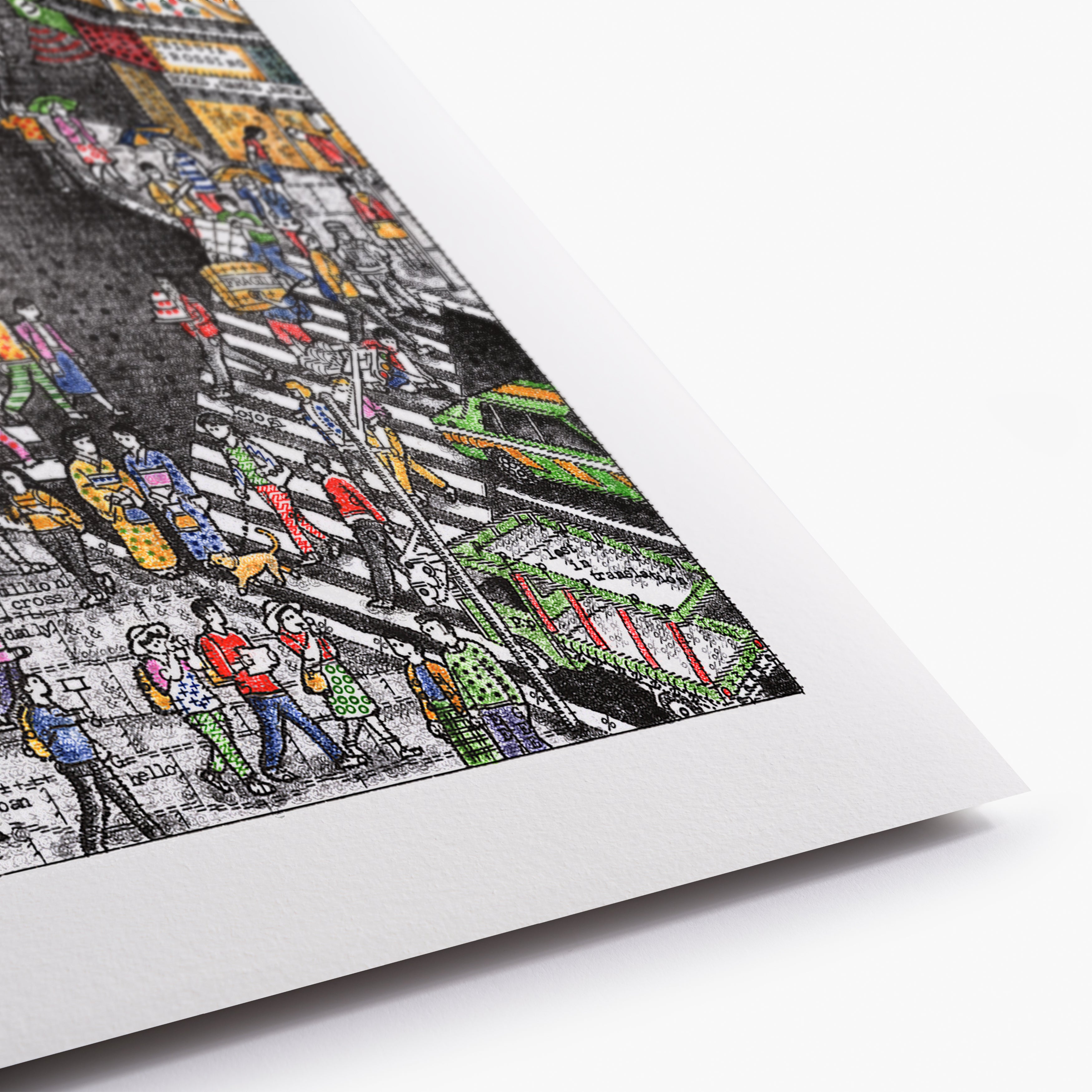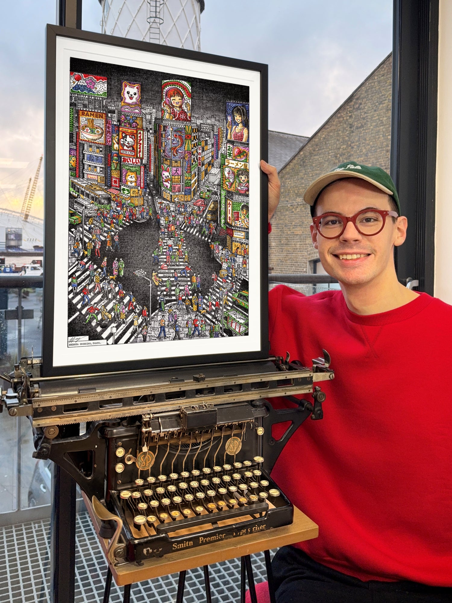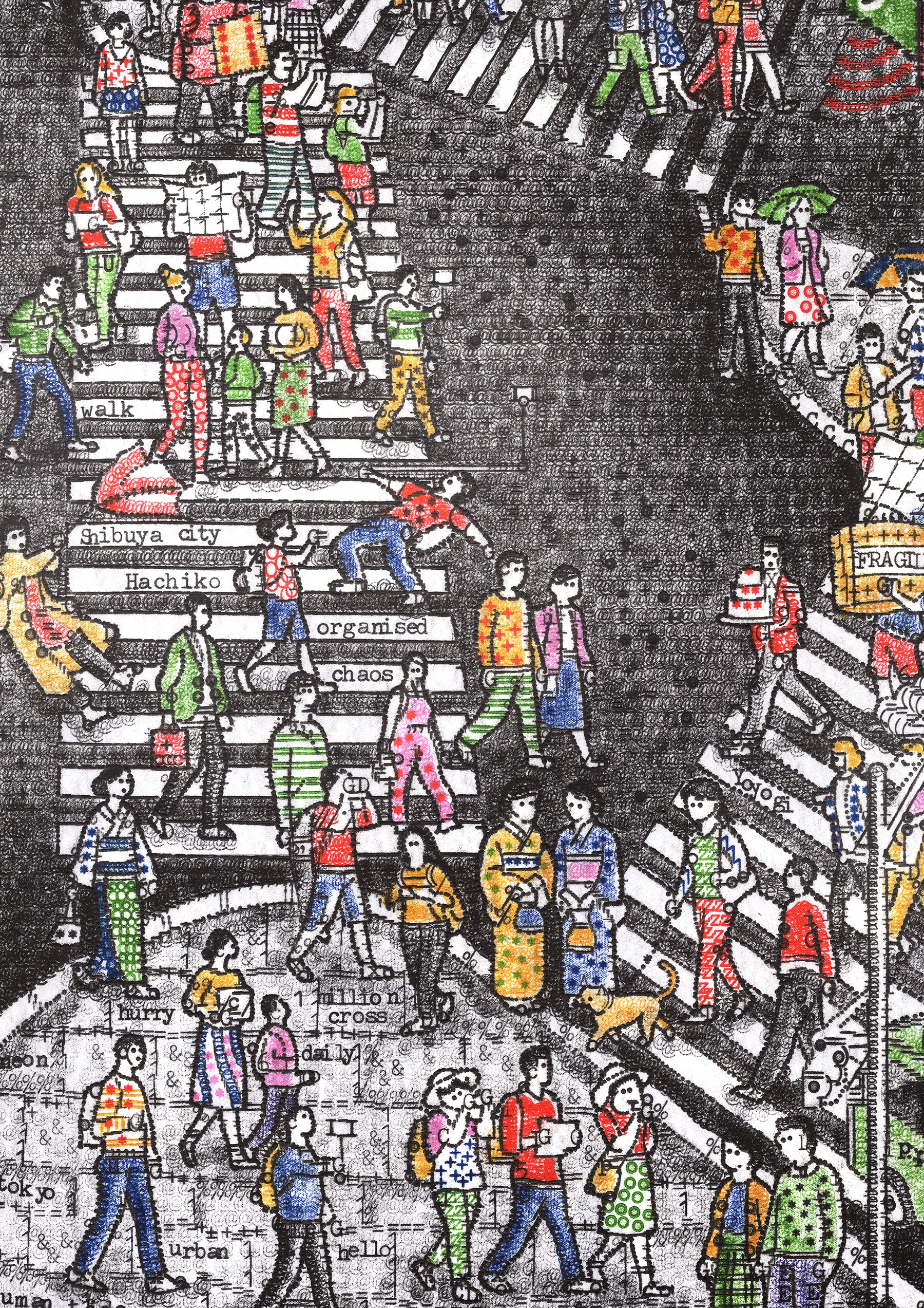Typed over four weeks on a 1930s Smith Premier, Evening in Tokyo captures the neon energy of Shibuya Crossing. I have used my entire collection of vintage colour ribbons to bring the scene to life, populating it with hundreds of pedestrians and hidden micro-stories—from a tourist limbo-ing under a selfie stick to a gentleman carrying a massive cake.